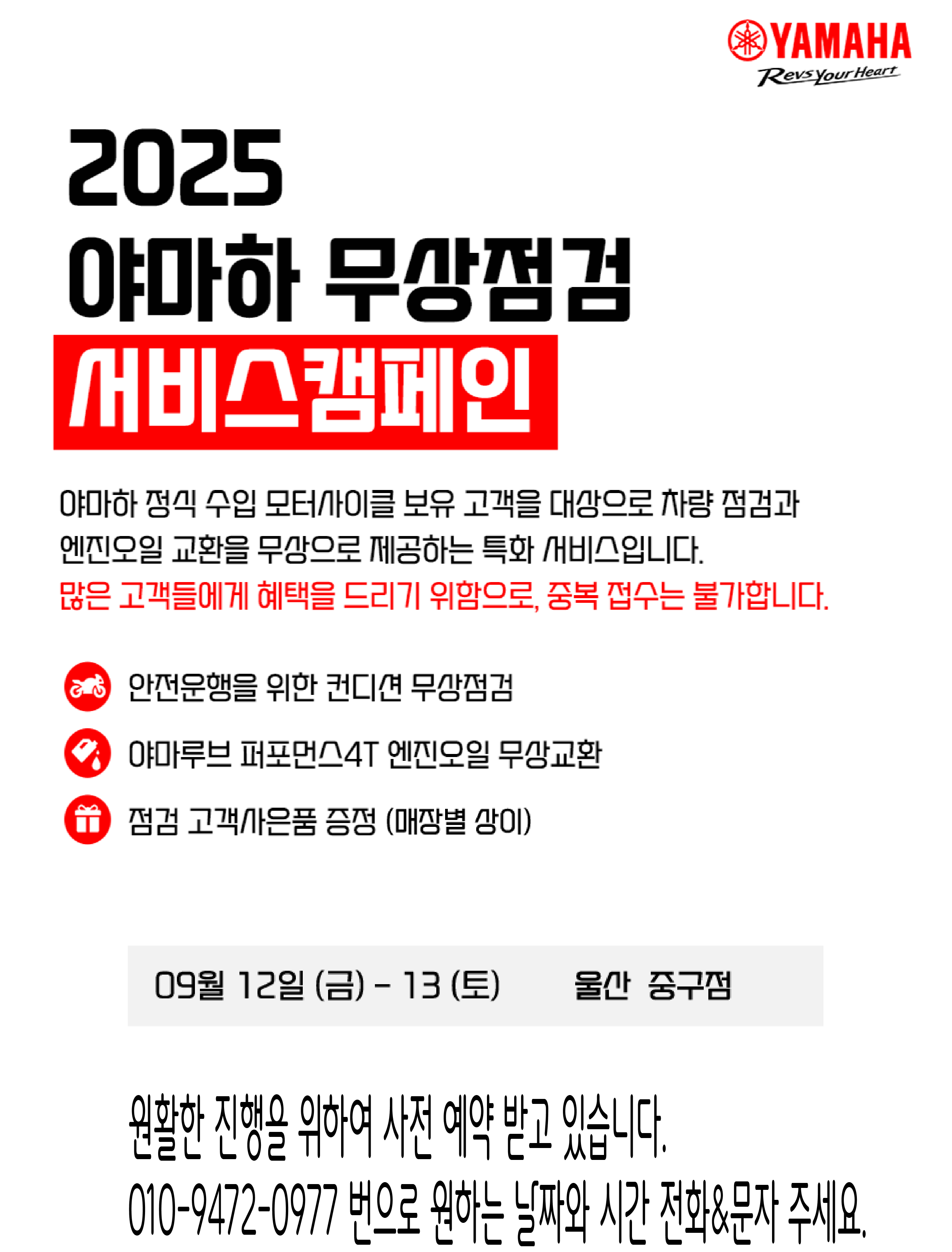 야마하 차량을 타고 있는 라이더 분들을 대상으로 엔진오일 야마루브 퍼포먼스 4T(공임포함 1통 15,000원) 무상 교환과 차량 점검(공임 포함 55,000원)을 무상으로 진행합니다.